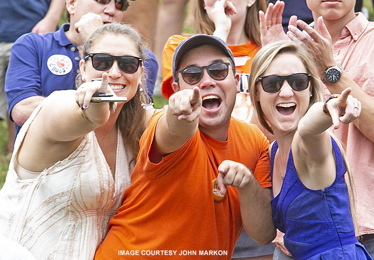 Young U.Va. alumni (from left) Mary Ann Goode, Ray Ramirez and Carrie Leon celebrate on the Hill