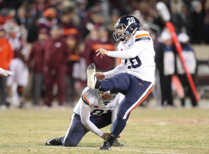 Virginia’s Brian Delaney attempts a field goal against Virginia Tech last season (Photo by Matt Riley, UVA Media Relations).