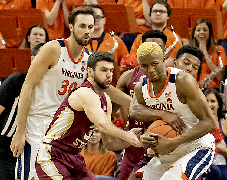 Mamadi Diakite wrestles a loose ball away from FSU’s Wyatt Wilkes earlier this season (Photo by John Markon).