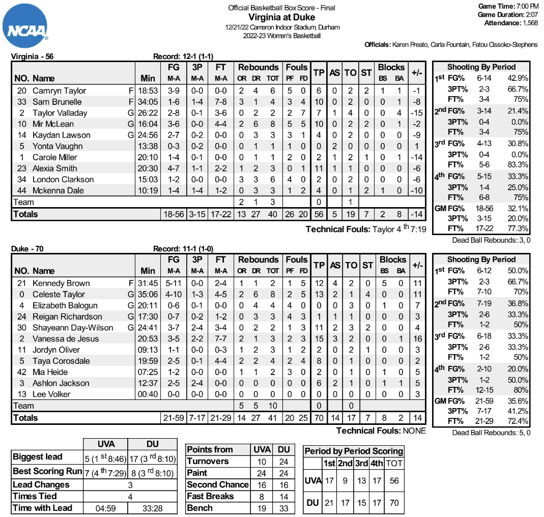 The Devils shot 36 percent (21 for 59), including 41 percent (7 of 17) from 3-point land. Duke also sank 21 of 29 from the charity stripe (72 percent) and edged the Hoos on the glass, 41-40.