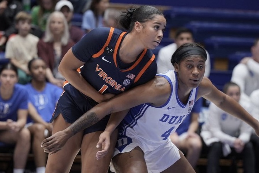 Virginia’s Carole Miller is boxed out by Duke’s Elizabeth Balogun. (Photo: UVA Athletics)