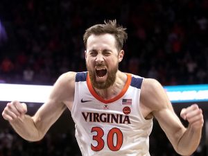 Jay Huff exults after the Cavaliers foil a Duke possession in the final seconds of a 52-50 win over the Blue Devils (Photo by John Markon).