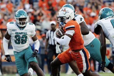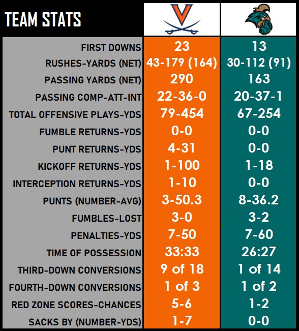 After the dust had settled, Virginia put up 454 yards of total offense, played a hair-chested stretch of defense by limiting the Chanticleers to a mere 254, including 163 from Coastal’s new “Air Raid” passing game, ripped from the playbook of the late, great Mike Leach, in addition to special teams domination.