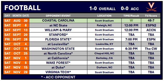 - With the win, Virginia improved to 2-0 all-time against Coastal Carolina. The first meeting was played in Conway, S.C., in 2024, while Saturday marked the teams’ first matchup at Scott Stadium.