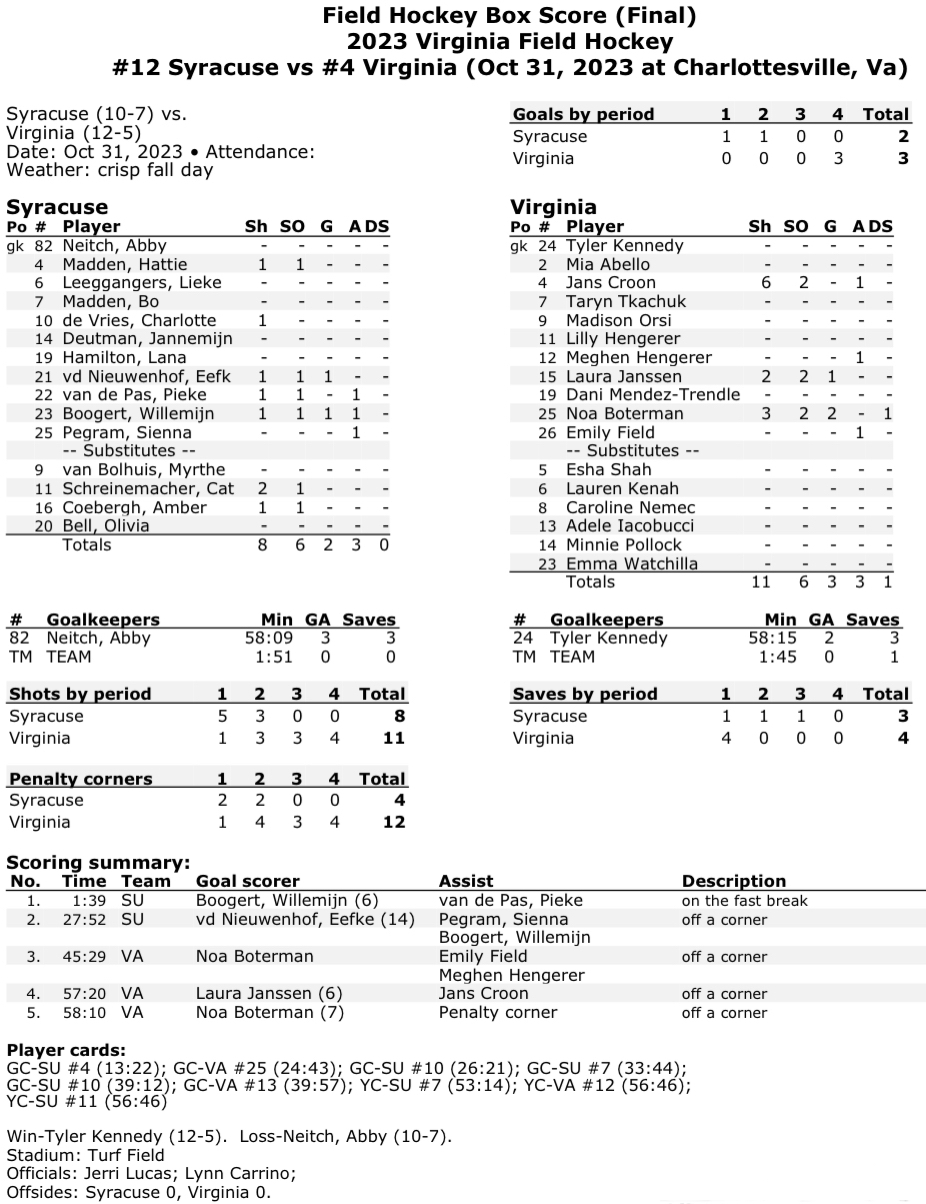 Virginia was awarded a penalty corner thirty seconds into the final period. Boterman’s strike from the top of the circle deflected off a Syracuse stick to cut the deficit in half.