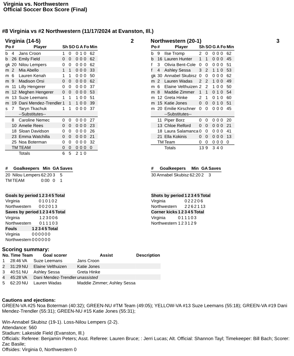 Northwestern scored the equalizer 1:29 into the second half. The Wildcats then took the lead on a goal with 4:09 remaining in the third to take a 2-1 lead.
