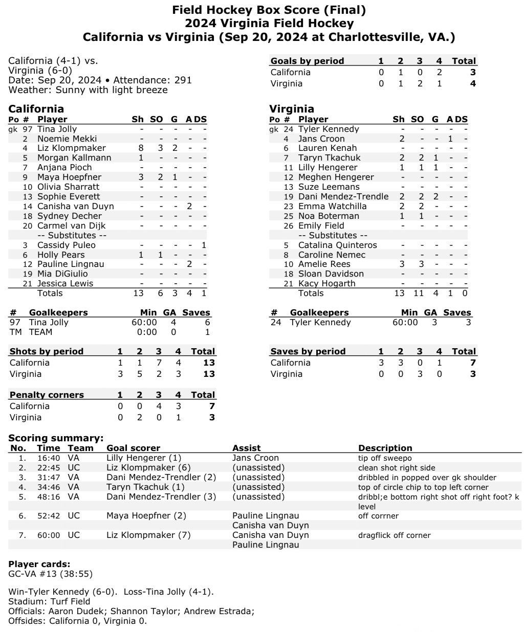 - Cal and Virginia each took 13 shots. Cal had a 7-3 edge in penalty corners