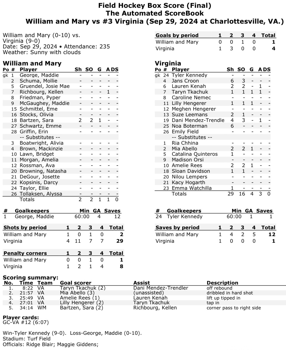 Virginia took 14 shots in the second quarter, but William and Mary goalkeeper Maddie George recorded seven saves to keep the Cavaliers from adding to their lead. George finished the game with 12 total saves.