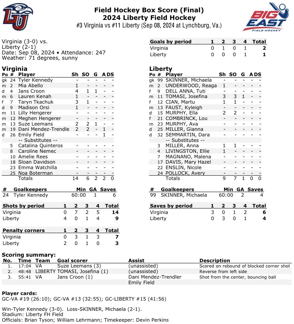 Virginia (3-0) held that same advantage heading into the fourth quarter. Liberty’s Josefina Tomasi hit a reverse to tie the game, 1-1, 3:48 into the final frame.