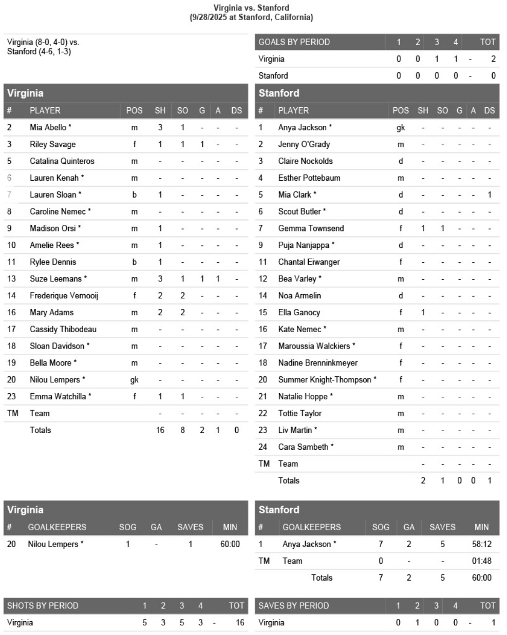 Starting in goal, Virginia’s Lempers recorded one save while Stanford’s starting goalkeeper, Anya Jackson, recorded five saves and allowed two goals.