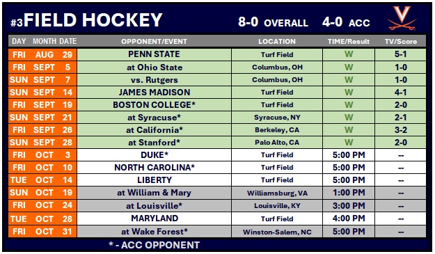 The No. 3 Virginia field hockey team remains undefeated after shutting out Stanford, 2-0, on Sunday at Stanford Varsity Field Hockey Field in Stanford, Calif.