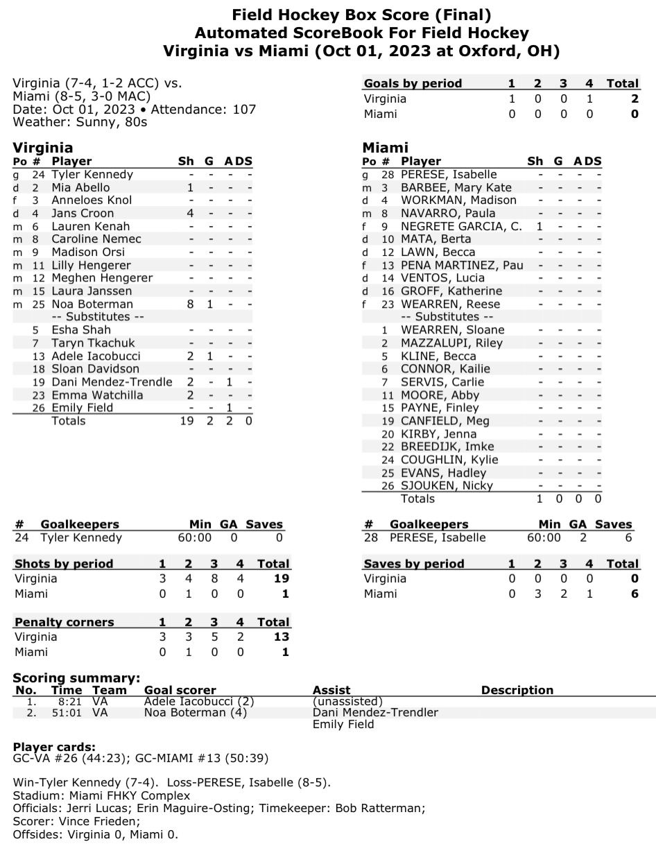 The No. 7 Virginia field hockey team picked up a 2-0 victory at Miami University on Sunday at Miami Field Hockey Complex in Oxford, Ohio. The Cavaliers outshot the RedHawks, 19-1. Adele Iacobucci and Noa Boterman scored the Virginia goals.