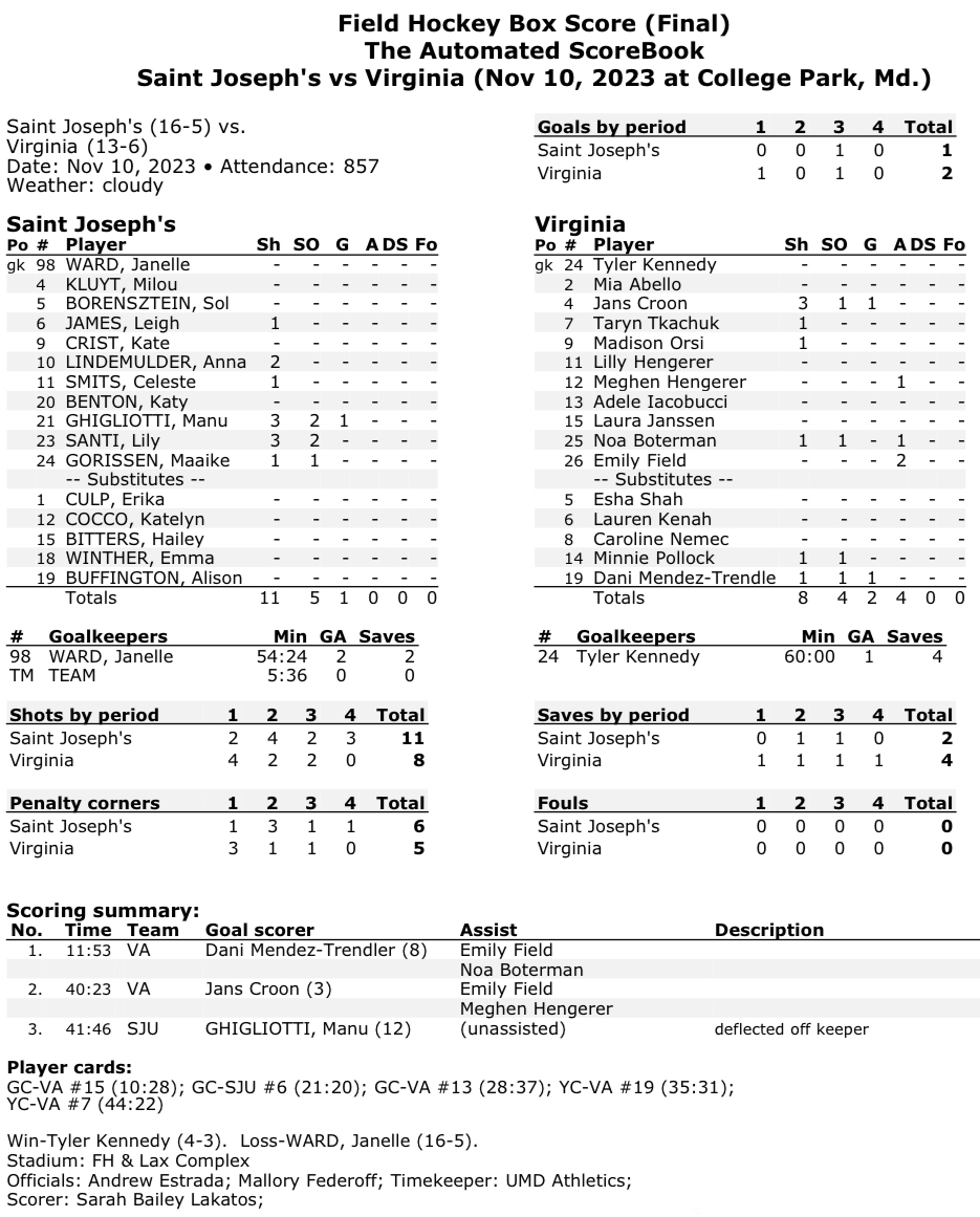 The Virginia field hockey team opened the 2023 NCAA Field Hockey Championship with a 2-1 victory against Saint Joseph’s on Friday at Maryland’s Field Hockey and Lacrosse Complex in College Park, Md.