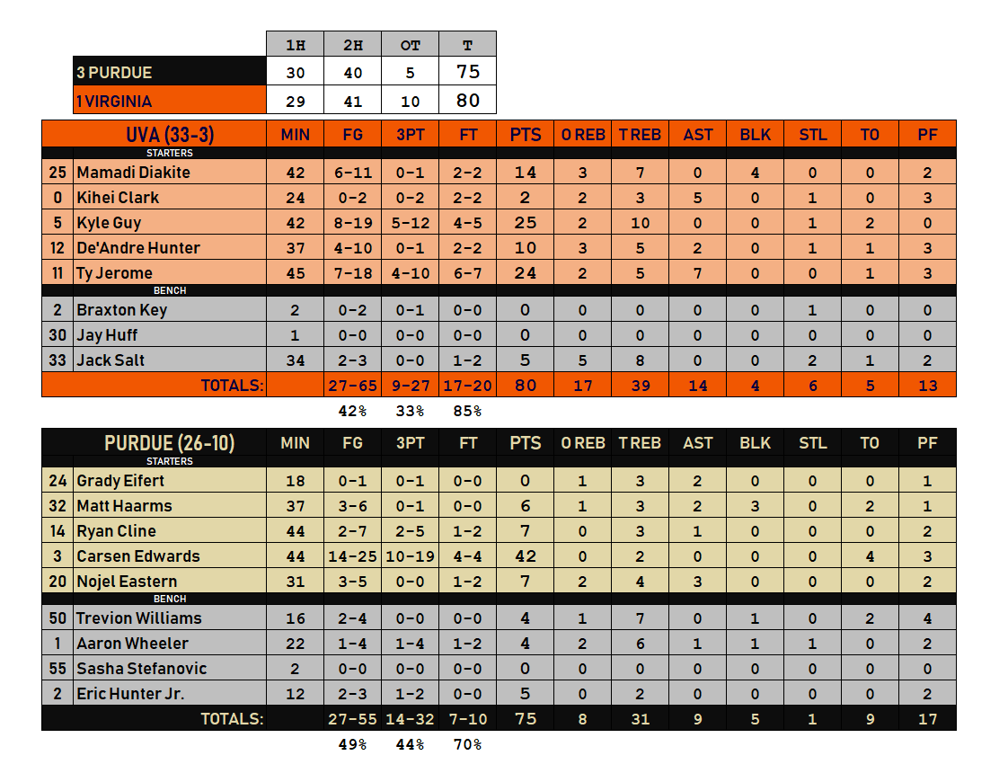 Virginia embraced that quote Saturday night, playing in essentially a road game (the crowd was about 75 percent Purdue fans, and they got very loud at times), overcoming one of the greatest shooting performances in recent tournament history by Carsen Edwards, and gutting it out in a do-or-die, win-or-go-home overtime scenario.