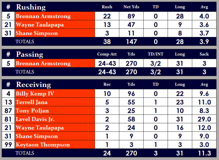 In just his second career start, UVA redshirt sophomore Brennan Armstrong finished the game 24 for 43 for 270 yards and 3 touchdowns, and led the Wahoos in rushing with 22 carries for 89 yards in the losing effort (all of those numbers, minus the passing attempts, were career highs).