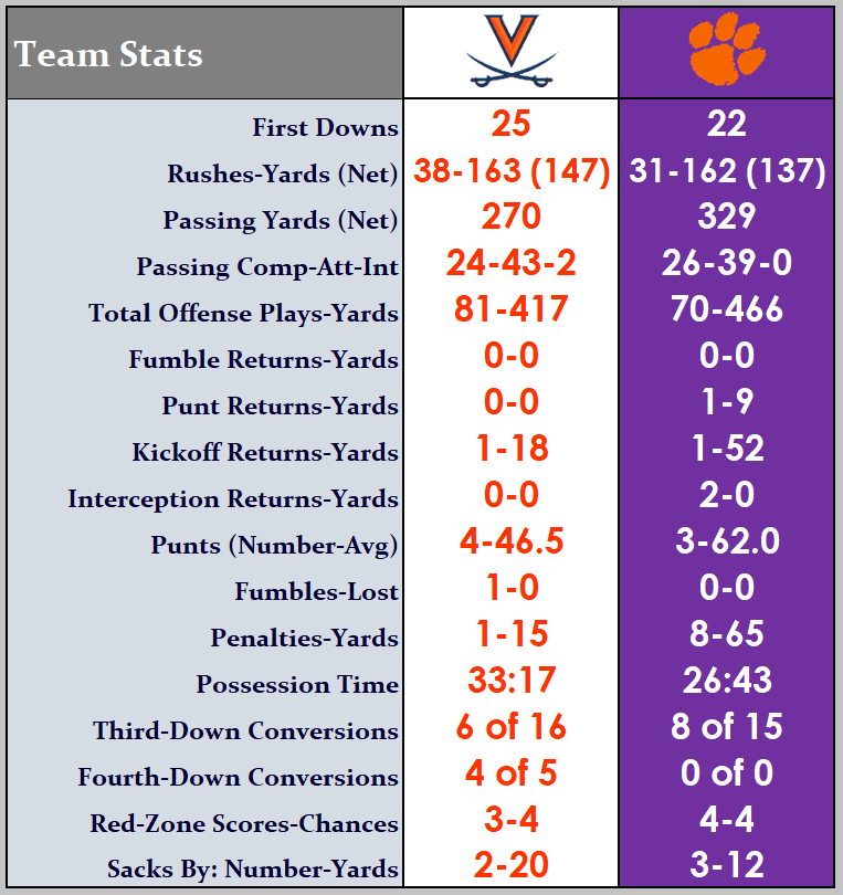 The Cavaliers (1-1, 1-1 ACC) had a hard time stopping Clemson (3-0, 2-0) on third downs, as the Tigers finished the contest 8 for 15, with several of those being converted with double-digit yards to go.