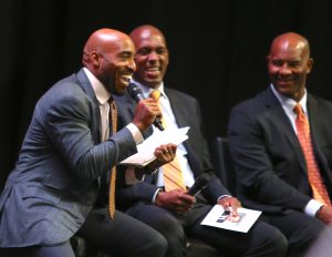 From left: Penn State greats Lydell Mitchell, Charlie Pittman and Franco Harris.