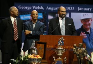 Harris became one of the game’s all-time great running backs and his notoriety grew with his involvement in “The Immaculate Reception,” a freakish tipped catch by Harris from Terry Bradshaw that allowed the Steelers to upset the Oakland Raiders in a 1972 playoff game. Harris went on to become a Pro Football Hall of Fame inductee, and was in Charlottesville to honor Welsh.