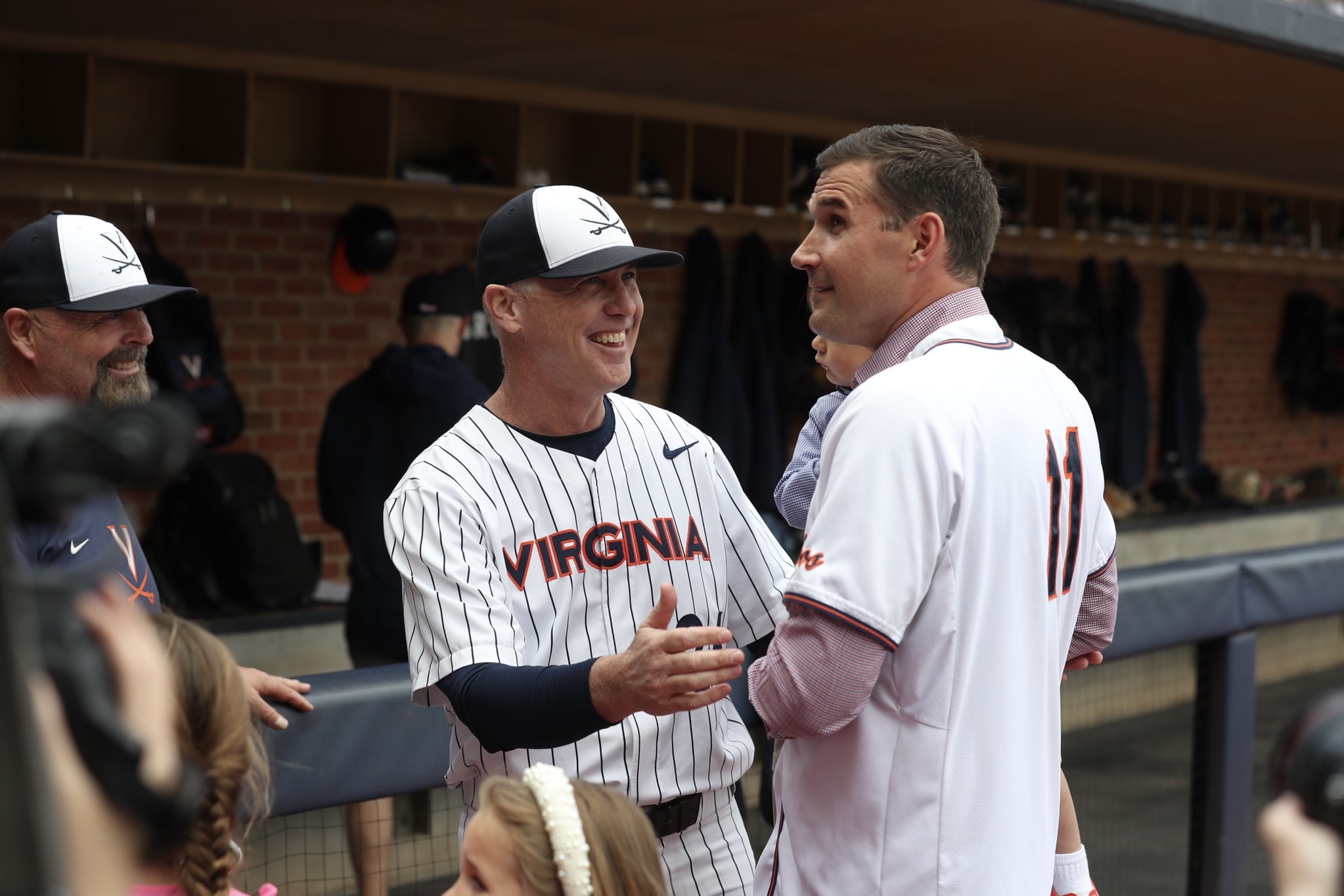 UVA coach Brian O’Connor (left) shares a laugh with Cavalier legend Ryan Zimmerman in the dugout Saturday. (Photos: Matt Riley | UVA Athletics)