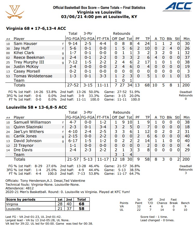 Sam Hauser delivered an All-American performance with a season-high 24 points. The Cavaliers defense regained its usual suffocating style of play. UVA dominated Louisville on the Cardinals home court for a 68-58 win.