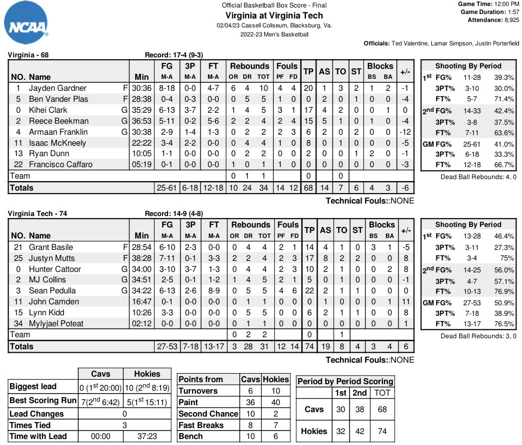 The focus paid off on Saturday when the Hokies dealt the Cavaliers a 74-68 defeat at Cassell Coliseum, ending UVA’s seven-game winning streak, the second-longest Power 5 streak in the country behind No. 1 Purdue.