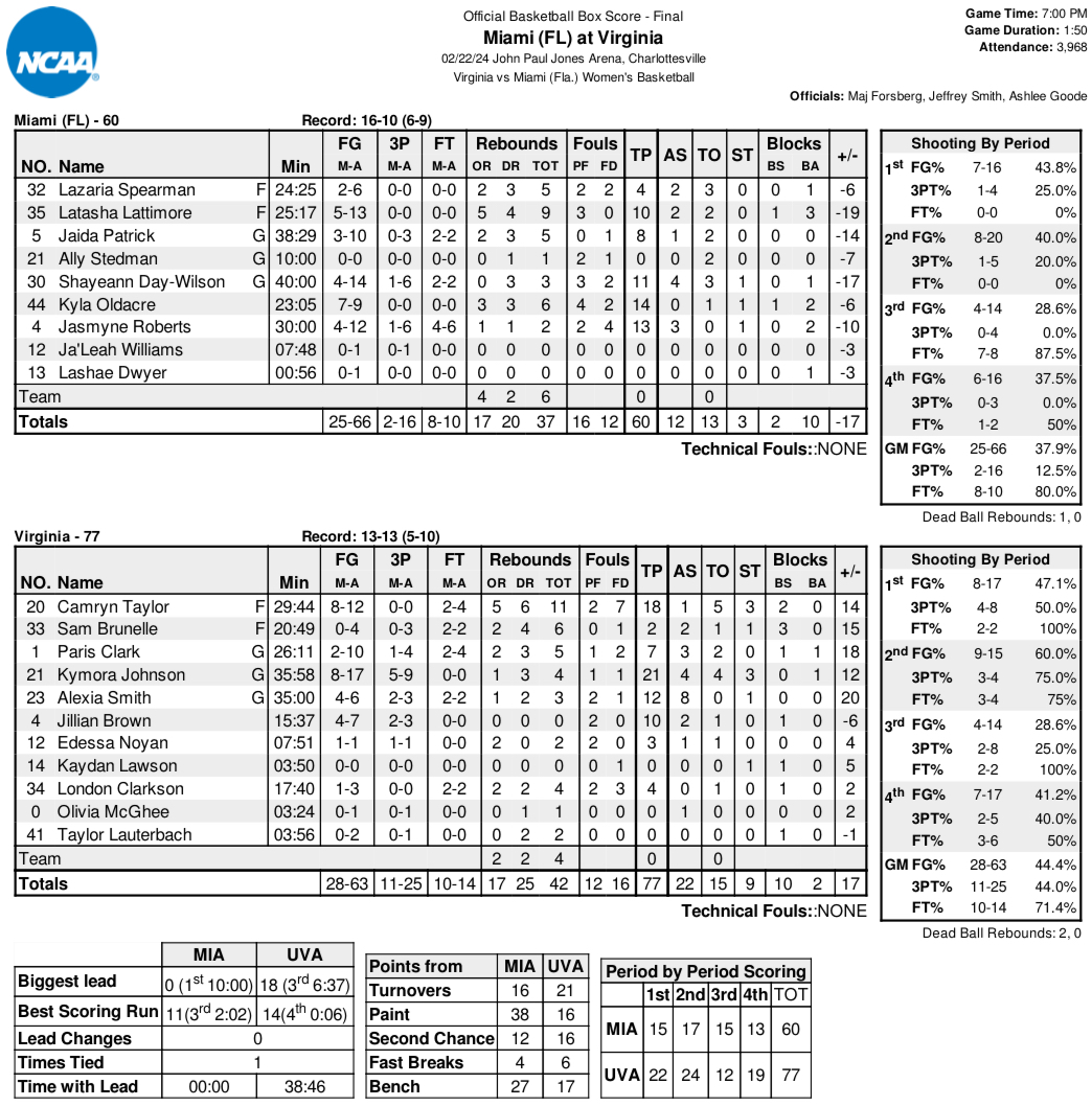 Kymora Johnson led all scorers with 21 points on 8-of-17 shooting and dished out 4 assists. Johnson has scored at least 20 points in six of UVA’s last nine games. Camryn Taylor totaled 18 points on 8-of-12 shooting and added a game-high 11 rebounds to record her 12th career double-double, also her fourth of the season.
