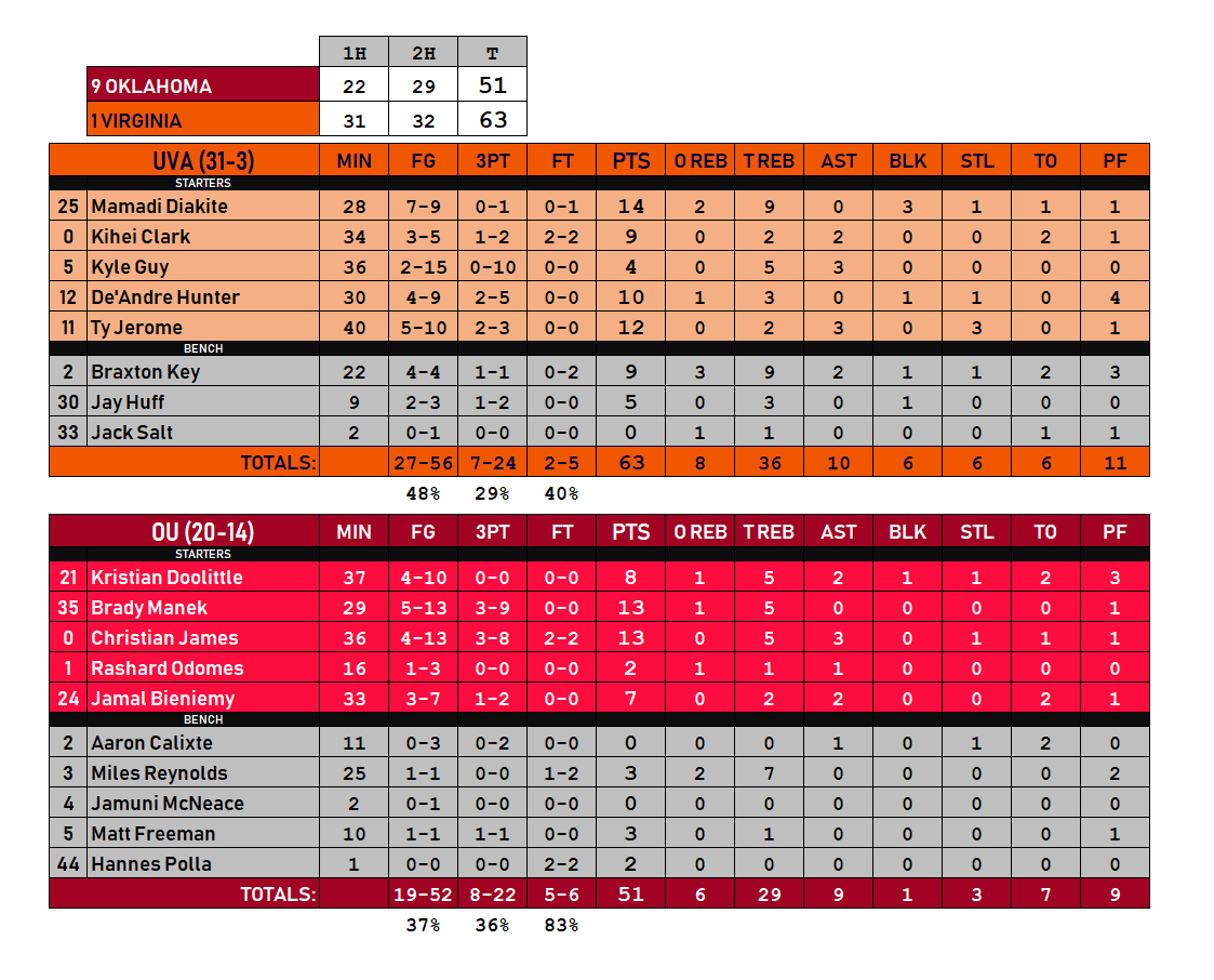 UVA outscored Oklahoma, 32-12, in the paint and out-rebounded the Sooners, 36-29, committing just 6 turnovers on the night. The Wahoos shot 48 percent from the field (27 for 56) but just 29 percent from downtown (7 for 24).