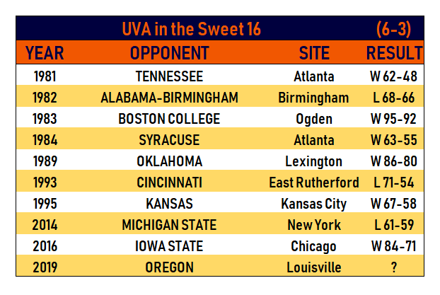 The Cavaliers (31-3) will be moving onto the Sweet 16 for the 10th time in program history on Thursday night at 9:59 p.m. in Louisville against No. 12 Oregon on TBS. It’s the first trip to the Regional Semifinal round for the ‘Hoos since 2016.