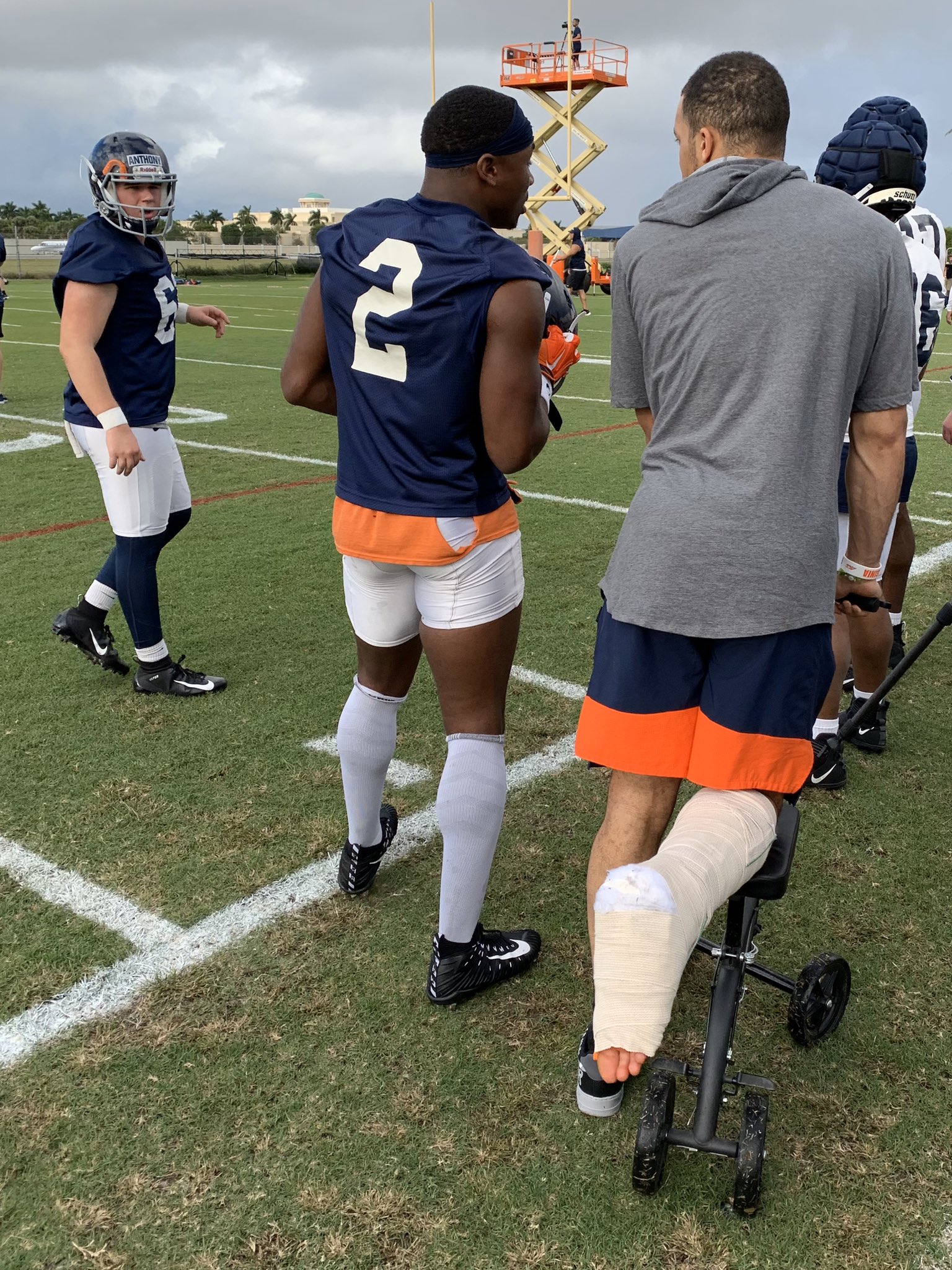 UVA senior linebacker Jordan Mack (far right) is seen sporting a cast and using a rolling scooter during the team’s Orange Bowl practice Friday (Photo courtesy Damon Dillman, WCAV CBS19 Sports).