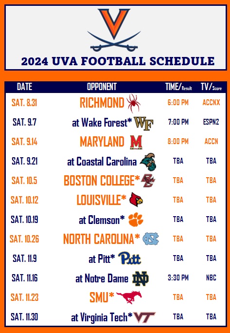 As part of the announcement of early-season and non-Saturday football television selections, the Atlantic Coast Conference announced Thursday the kickoff times and broadcast originations for Virginia’s first three games of the 2024.