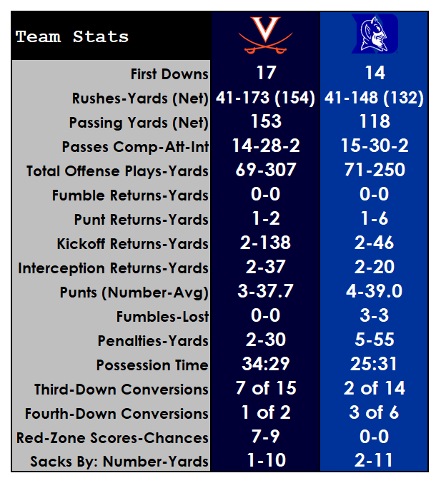 Duke recovered a Dubois fumble on the ensuing kickoff and took over at the UVA 30-yard line, but it was a case of too little, too late for the Devils.