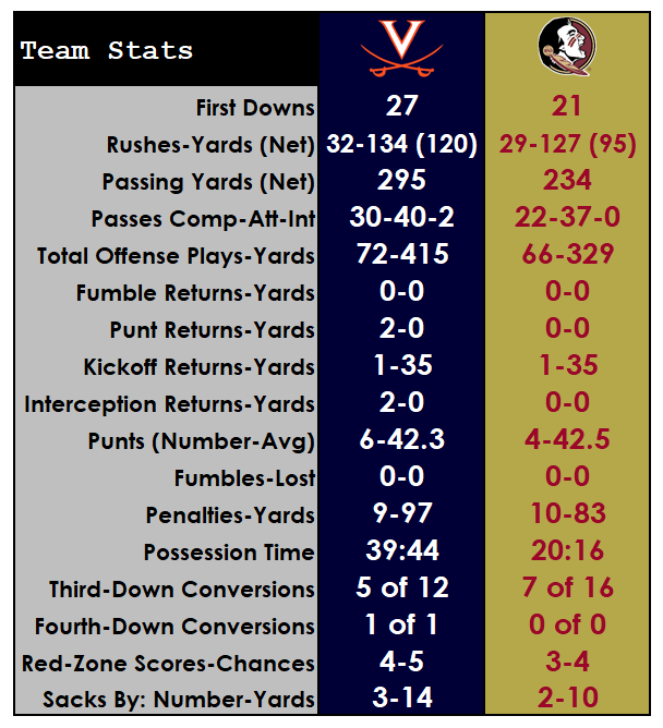 PASSING: FSU — James Blackman 22-37-0-234. UVA — Bryce Perkins 30-40-2-295.