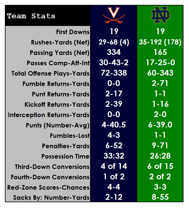 RUSHING — UVA: Wayne Taulapapa 10-31; Joe Reed 1-3; PK Kier 2-(-1); Bryce Perkins 16-(-29). ND — Tony Jones Jr. 18-131; C’Bo Flemister 6-27; Ian Book 7-10; Jahmir Smith 3-8; Michael Young 1-2.