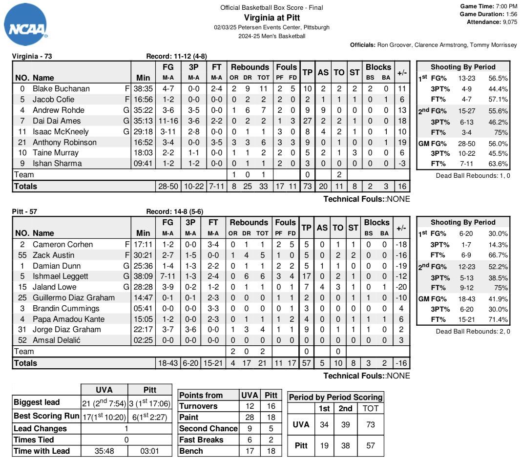 The lead grew to 30-10 after consecutive buckets by Ames with 4:44 until halftime, and he scored the final bucket of the period with 27 seconds left, as the Hoos took a 34-19 lead into the break. Pitt had just as many turnovers in the first half (6) as made field goals, shooting just 30 percent overall and 14 percent (1 of 7 from 3-point range).