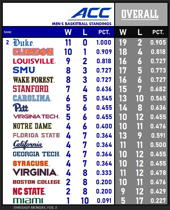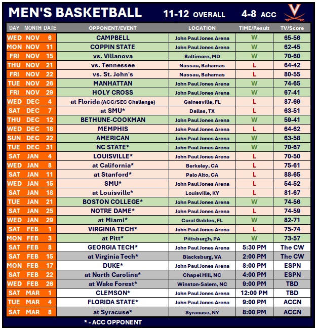 - The Cavaliers improved to 11-12 overall, 4-8 ACC