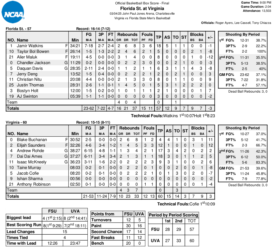 Despite a few lengthy droughts, the Cavaliers shot at a slightly higher clip from the field (40 percent; 21 for 53) than the Seminoles (37 percent; 23 for 62), and connected on 46 percent (11 of 24) from long range (FSU was 7 of 22 from deep; 32 percent).