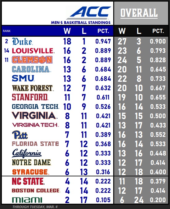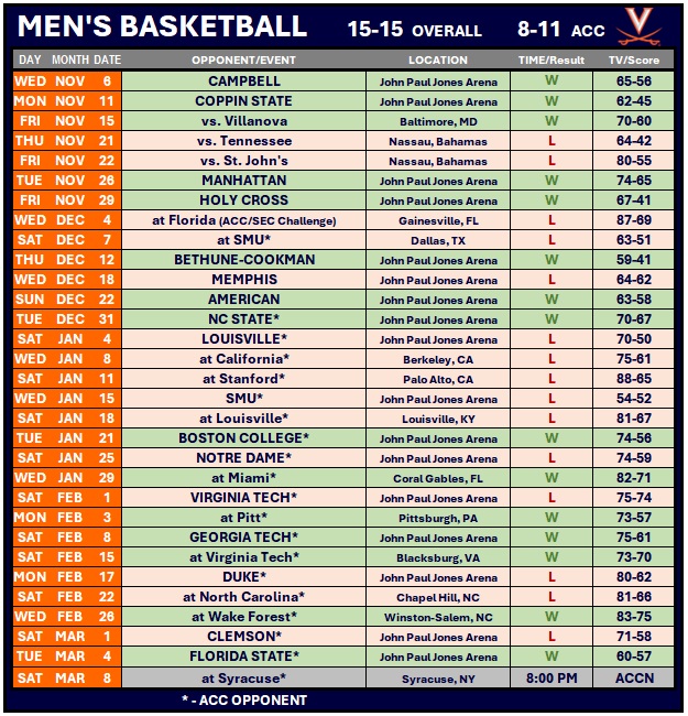 With the win, the Cavaliers (15-15, 8-11 ACC) moved into a tie with Virginia Tech for ninth place heading into the final weekend of competition before next week’s ACC Tournament in Charlotte.