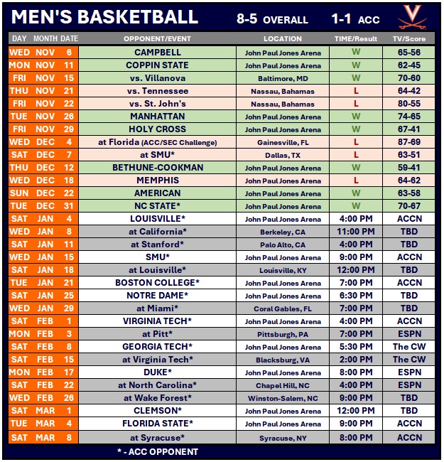 - Virginia improved to 8-5 overall, 1-1 ACC