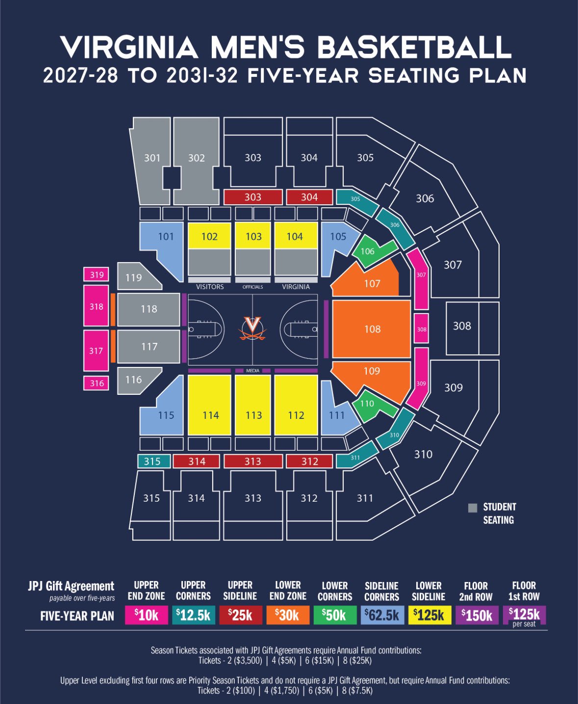 The Virginia Athletics Foundation and Virginia Athletics has announced a new men’s basketball seating plan for John Paul Jones Arena beginning with the 2027–28 season.