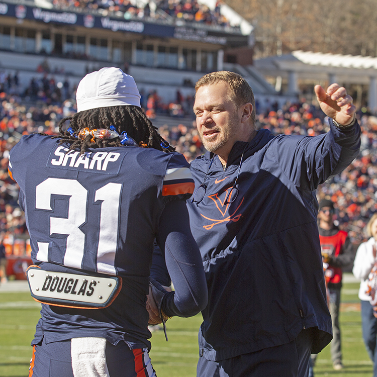 UVA Coach Bronco Mendenhall had a Senior Day embrace for all his graduating players, including backup tailback Chris Sharp (Photo by John Markon).