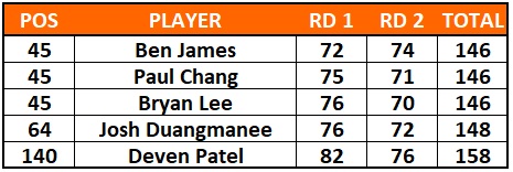Lee carded five birdies and closed the day with two birdies on his last three holes. He sits in 45th place after he climbed 62 spots on the individual leaderboard and is 2-over for the tournament. He shares 45th place with teammates Paul Chang and Ben James. Chang shot a 1-under 71 in a round that featured four birdies while James was 2-over on Saturday.