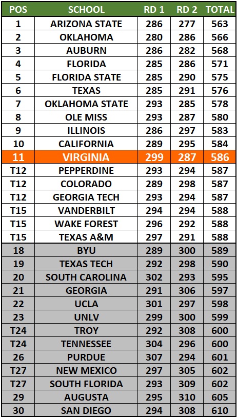 With 36 holes played, the Cavaliers are seeking one of the top 15 spots after Sunday’s third round that will allow them to advance the fourth and final stroke play round on Monday. After the fourth stroke-play round, the top eight teams advance to match play to determine a national champion.