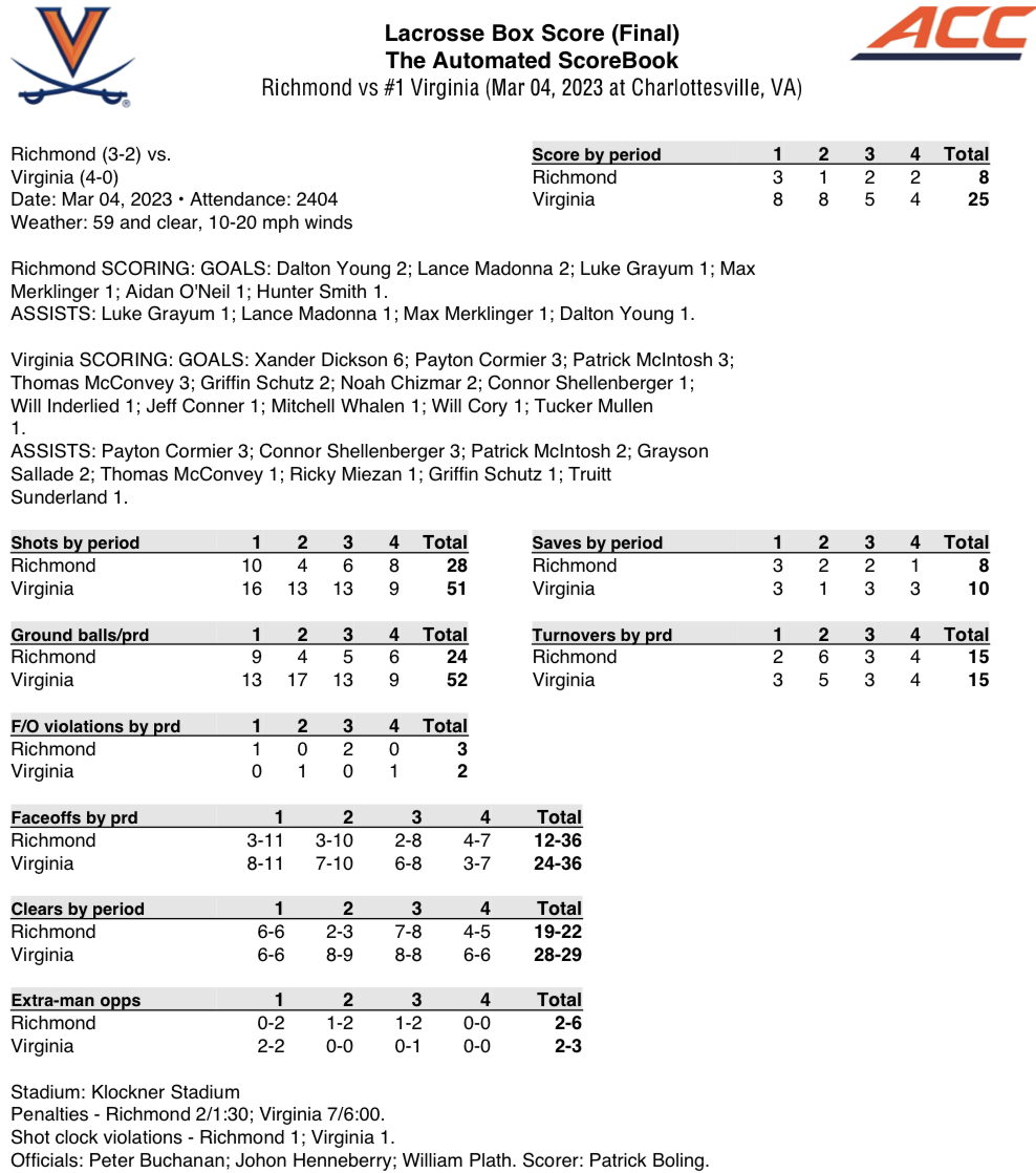For the second consecutive game, the Cavaliers scored the first eight goals of the contest, leaping out to a hefty lead to start the game. During the scoring spree, Cormier tallied five of his total six points on back-to-back goals and three assists. A non-releasable illegal bodycheck penalty by the Spiders led to UVA going 2-for-2 on its extra-man unit in the first as McConvey and Dickson both netted goals. Richmond (3-2) broke up the Cavaliers’ scoring spree by finding the back of the net four times in a row, including the last three of the opening quarter. The Spiders’ final goal of the first quarter came with less than one second remaining on the clock.