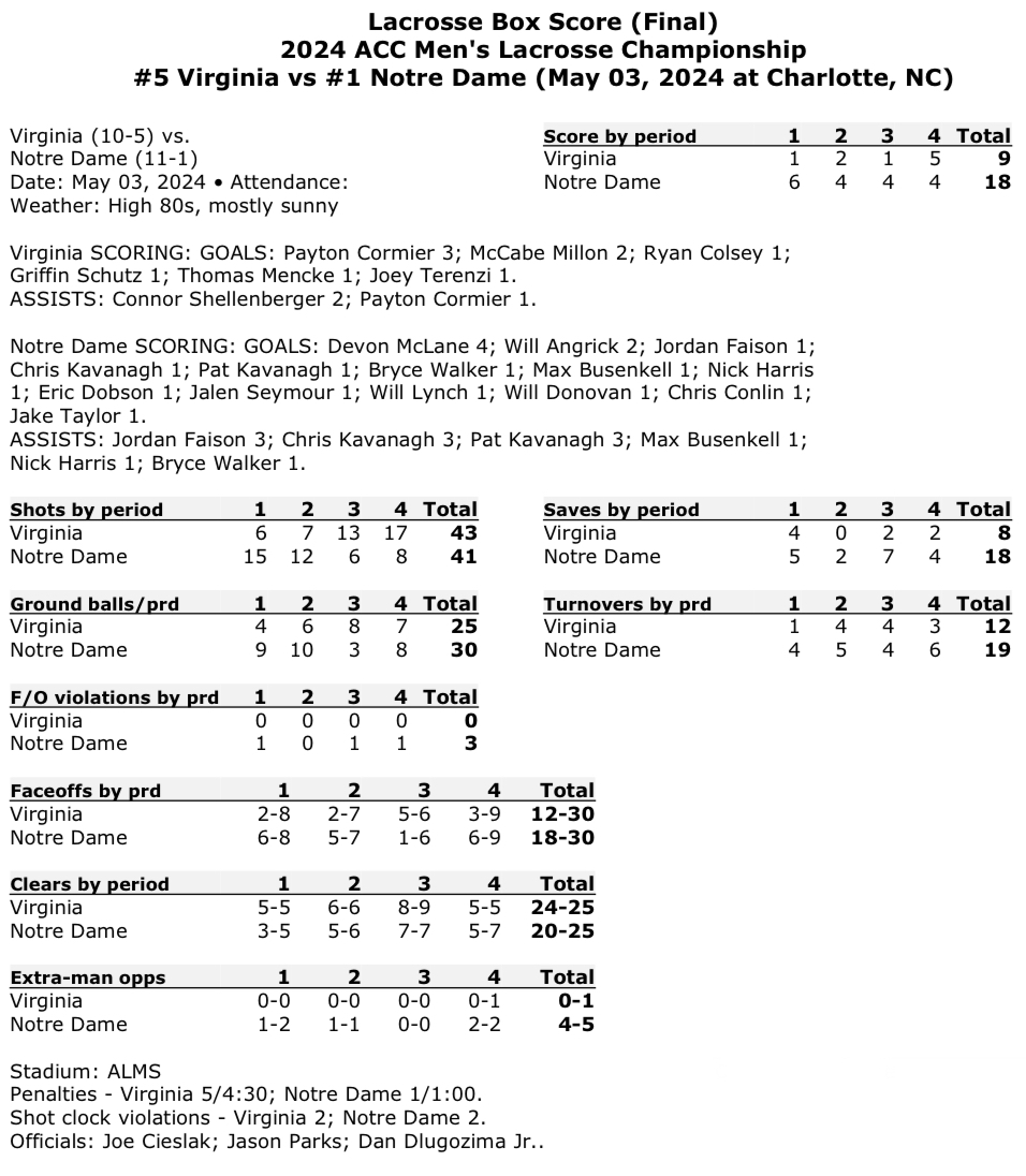 After a blocked Virginia shot, Jack Boyden collected the rebound and Cormier found Joey Terenzi on the wing, who buried his seventh goal of the year to give UVA some life. However, the Fighting Irish scored four of the next five goals, including their second man-up strike, to lead it 10-3 at the half.