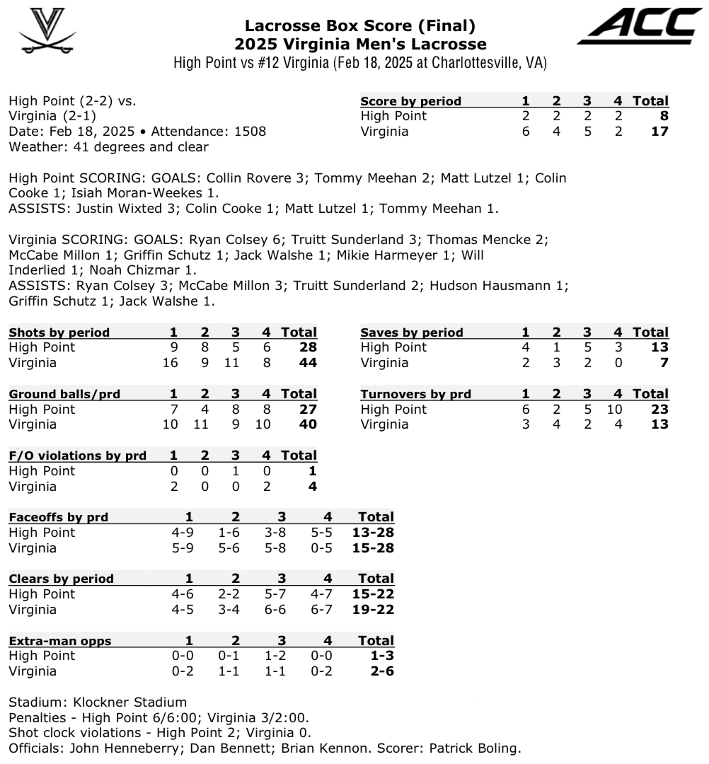 UVA’s Kyle Morris recorded another start between the pipes, making 5 saves and allowing 4 goals in 30 minutes of play. Mathew Nunes came out at the start of the second half and registered just 2 saves, allowing 4 goals in just over 28 minutes of play. Sophomore Colin Hook made his third college appearance, finishing out the game for the Cavaliers. High Point goalie Jack Overend battled the entire 60 minutes in net, making 13 saves.