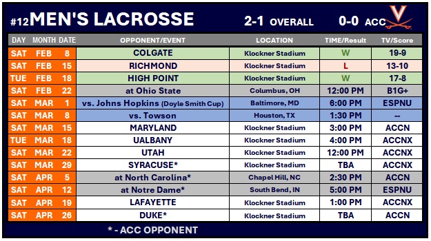 Virginia travels to Ohio State for its first road game of the season. Opening faceoff is set for noon and can be streamed with a paid subscription to B1G+.