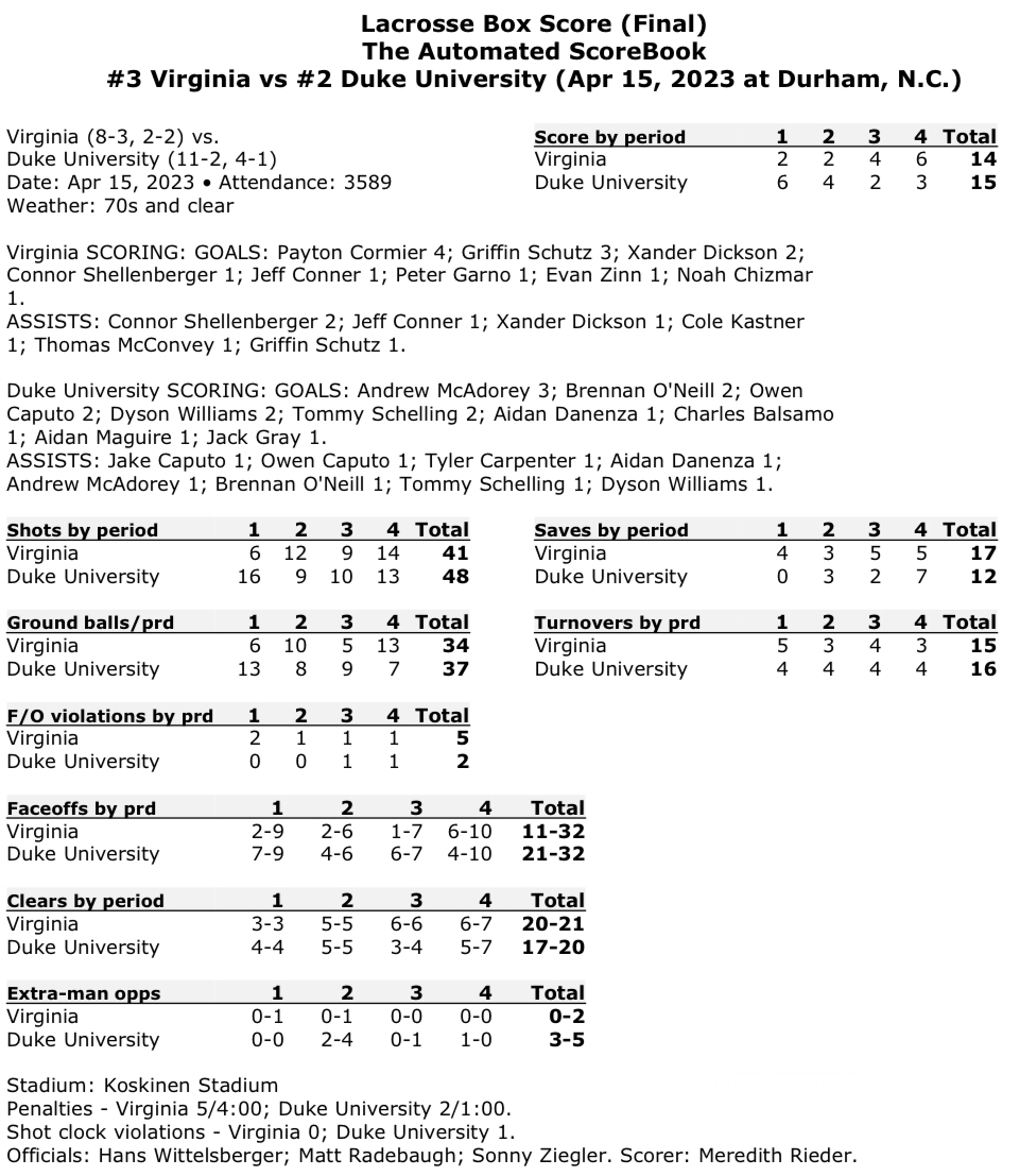No. 3 Virginia nearly overcame a six-goal deficit at halftime, but No. 2 Duke held on to win 15-14 at Koskinen Stadium Saturday afternoon in Durham.