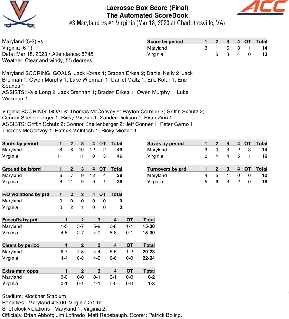 - Two of UVA and Maryland’s last five games have gone to overtime. Three of the last five meetings have been decided by one goal.