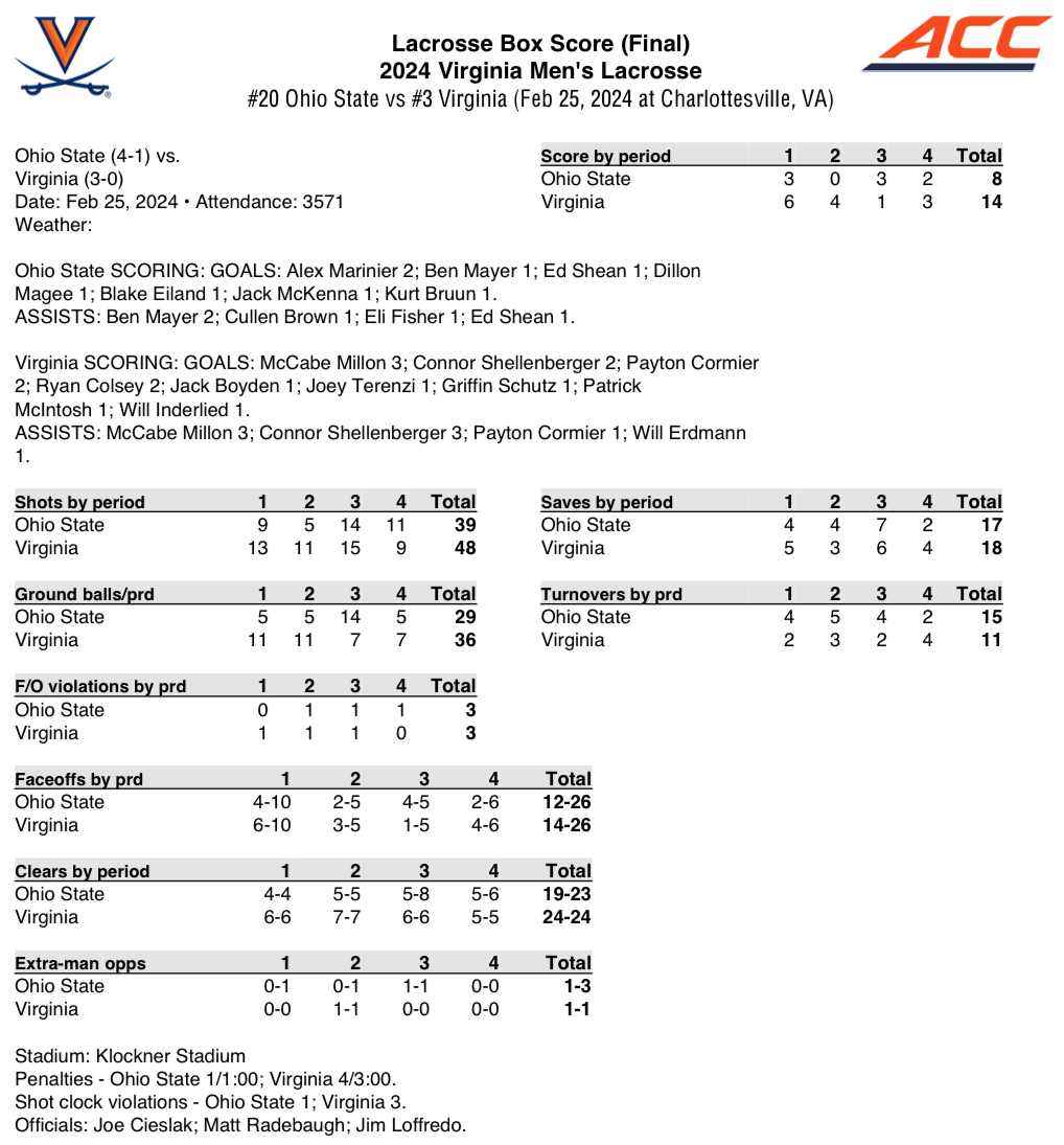 Virginia (3-0) jumped out to a 6-1 start in the game with six different Cavaliers scoring those goals. The Buckeyes (4-1) scored the final two goals of the first quarter to make it 6-3 heading into the second period.