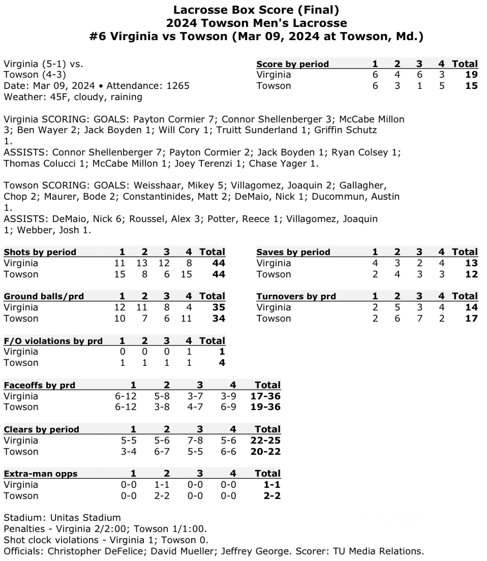 Defensively, Ben Wayer (2g, 6gb), Joey Terenzi (1a, 6gb) and Chase Yager (4ct) stood out for the Hoos. Matthew Nunes (5-1) earned the win in net for the Cavaliers, while Towson’s Luke Downs (4-3) suffered the loss.